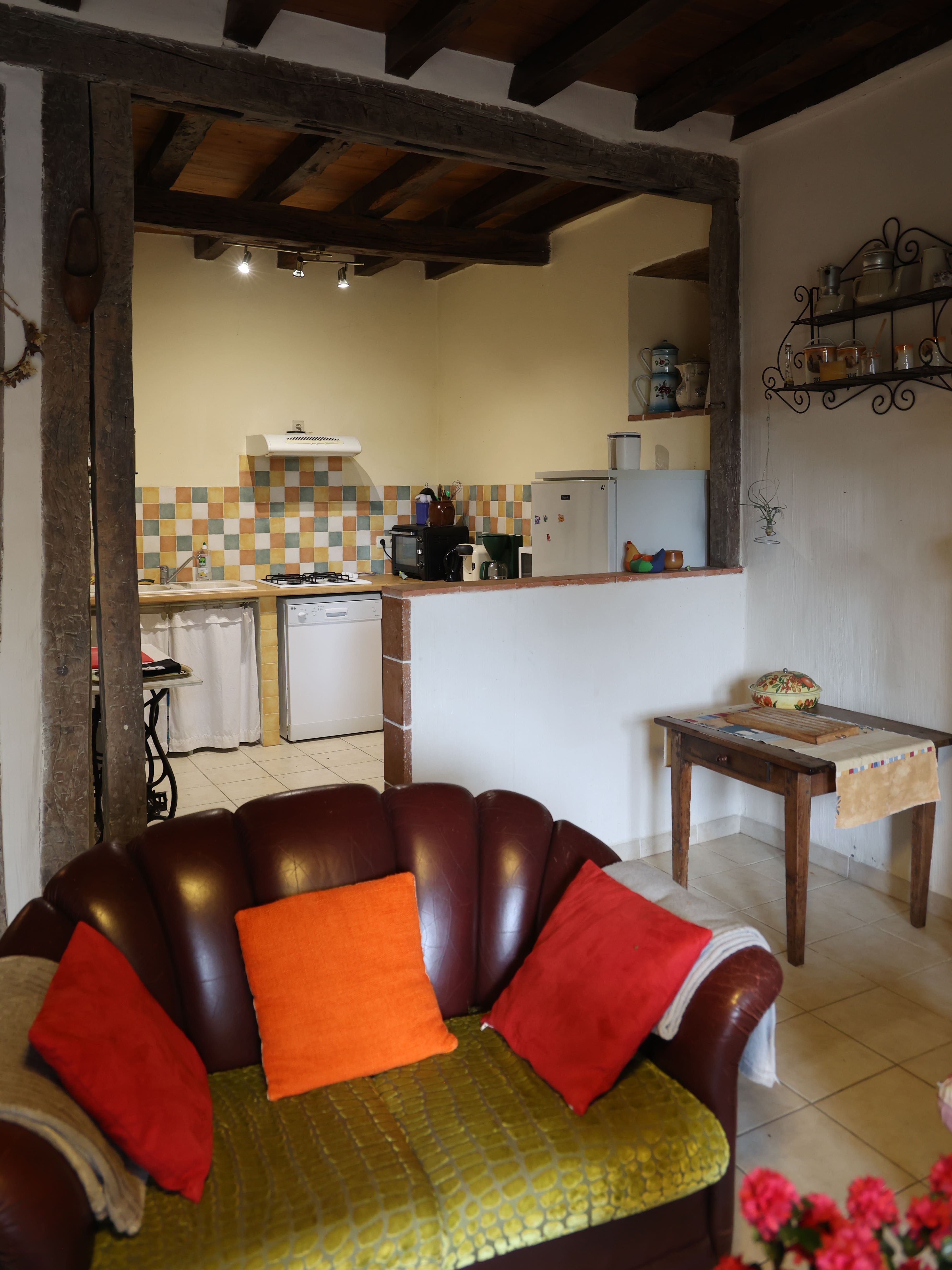 Installé dans un ancien corps de ferme restauré en 2011, ce gîte de 100 m² (rez-de-chaussée + étage) offre une décoration soignée, signée Annie Montégut, tapissière de métier. Charme de la pierre, poutres apparentes et mobilier artisanal créent une atmosphère chaleureuse.